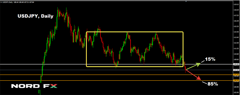 – USD/JPY. Здесь 85% экспертов считают, что, пробив нижнюю границу среднесрочного бокового канала, пара теперь устремится на юг, ставя целью закрепиться в зоне 106.00–107.00. Оставшиеся 15% аналитиков ожидают коррекции и возвращения пары к сопротивлению 108.80. Подтверждением такого сценария являются также сигналы о перепроданности, подаваемые третью осцилляторов на D1;