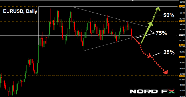 – пара EUR/USD продолжает удерживаться в зоне среднесрочного бокового канала 2018 года 1.2200-1.2525, а точнее, в центральной его части, постепенно снижая волатильность по сравнению с началом этого года. Ближайшим уровнем поддержки для нее на минувшей неделе эксперты назвали горизонт 1.2215, сопротивления – 1.2410, в районе которых пара и зафиксировала свои минимум – 1.2250 и максимум – 1.2413, показав размах колебаний менее 165 пунктов. Что же касается окончания недельной сессии, то пара зафиксировала результат на уровне 1.2288;