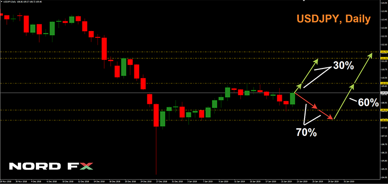 – USD/JPY. От этой пары в ближайшее время можно ожидать определенных сюрпризов, и причиной тому восточный Новый год. Традиционно это время не только подведения финансовых итогов, но и активных действий со стороны Банка Японии, который уже несколько лет подряд в этот момент начинает скупать и продавать большие объемы валюты. Такие интервенции могут вызвать скачки курса в несколько сотен пунктов, и на данный момент большинство аналитиков (70%), поддержанные графическим анализом на D1, ожидает сначала падения пары до зоны 108.00-108.55, а затем ее возвращения к горизонту 110.00. При этом около 60% экспертов считают, что пара не остановится на достигнутом и в течение месяца может достичь сопротивления на уровне 111.70;