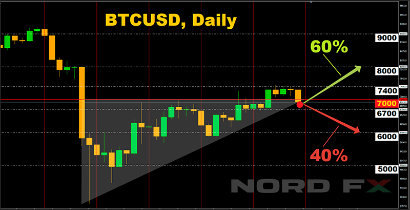В своем предыдущем прогнозе мы отметили, что, начиная с 20 марта, основная криптовалюта безуспешно пытается закрепиться выше уровня $7,000. Не стала исключением и минувшая неделя. 06 апреля быки прорвали это сопротивление и даже достигли высоты $7,440, однако в пятницу вновь сдали свои позиции, и пара опустилась в зону $6,850-6,900.